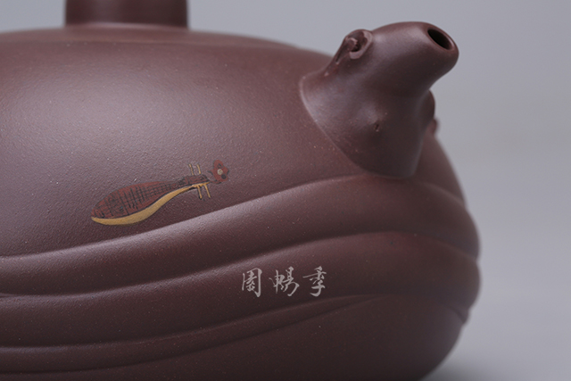 壶嘴以冬梅为型,剪雪裁冰,一身傲骨,比喻王昭君忠于汉室,为求汉胡和谐,忍辱负重的崇高气节。壶的另一边以曲谱线条为浮雕装饰,配一琵琶,一曲悲壮的离别之曲,南飞的大雁为昭君之貌停翅高飞!