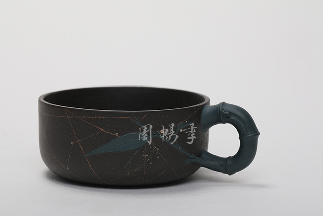 此冰梅套壶是作者于1996年精心制作,难度极高,采用松、竹、梅为主题,壶嘴为松段,胥出小枝,上蹲着一只小松鼠,紧盯着松果,松段上还露出截枝的毛刺,非常逼真形象,壶把为竹节,胥出竹枝竹叶,刚劲有力,竹叶飒爽,自然潇洒。壶盖为梅花,壶纽为梅花的花蕊,制作细腻精致,颇有难度,从壶纽胥出根根花蕊,又增添了花蕊的立体感,别具新意。壶身为绞贴泥制作,冰片中嵌入银丝,并有梅花贴泥装饰。整把壶虽围绕传统主题“松竹梅”进行,但作者将三者和谐的融合并表现在壶身,有新意且特别。